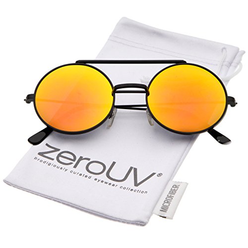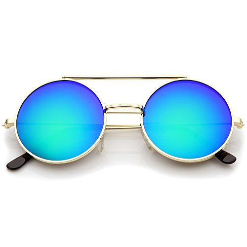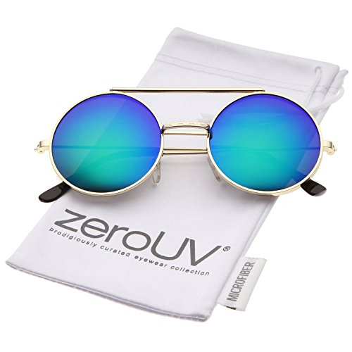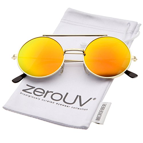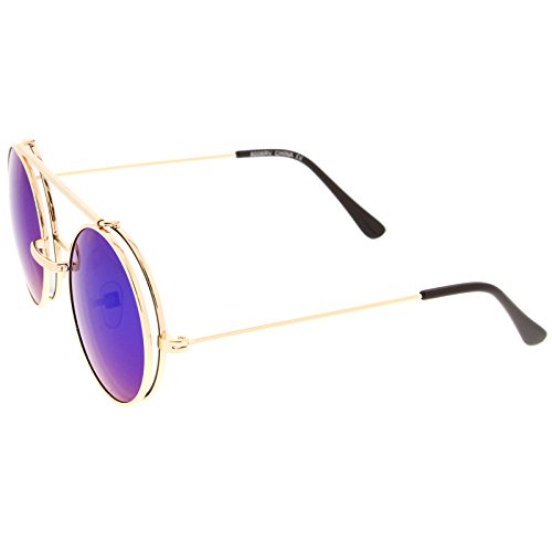 Edgy and cool, these metal round sunglasses feature a flip-up design providing versatility between clear and colored mirror lenses. Complete with a brow bar and ultra slim metal temples for a sleek feel, these unique sunglasses are a great statement piece for any look. Made with a metal based frame, English style nose pieces, metal hinges, and reflective UV400 protected lenses. Lens Height: 49 mm | Lens Width: 49 mm | Bridge: 23 mm | Frame Total: 133 mm