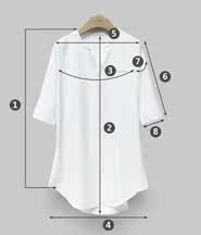 | 尺码 | ①前衣长 | ②后中长 | ③胸围 | ④下摆围 | ⑤肩宽 | ⑥袖长 | ⑦袖臂围 | ⑧袖口围 | ||