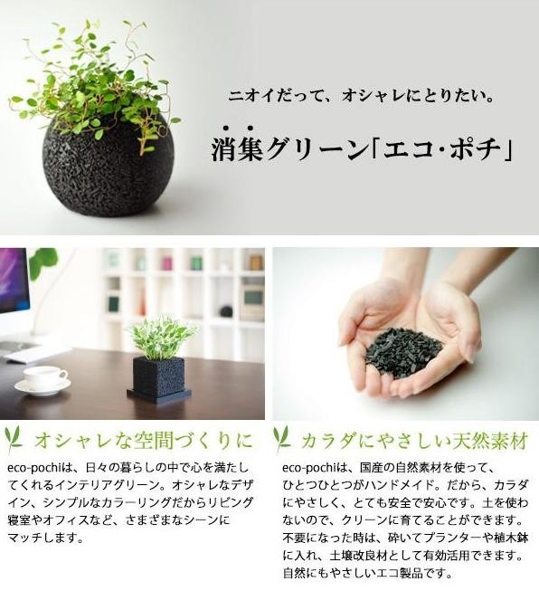 ニオイの元を吸着する竹炭(黒)・シラス(白)と、自然由来の「バチルス菌群」を使用したインテリアグリーン。タバコ・トイレ・生ごみ・ペットなどのあらゆるニオイを消臭します。お洒落なデザイン&シンプルなカラーリングだからリビング、寝室やオフィスなど、さまざまなシーンにマッチします♪ |