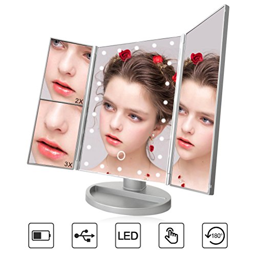 BJYHIYH Lighted Makeup Mirror with 3x/2x/1x/Magnification, Dimmable Trifold Cosmetic Mirror, Touch Screen and 180°Rotation Vanity Mirror with 22 LED Lights,Two Power Supply(Silvery)