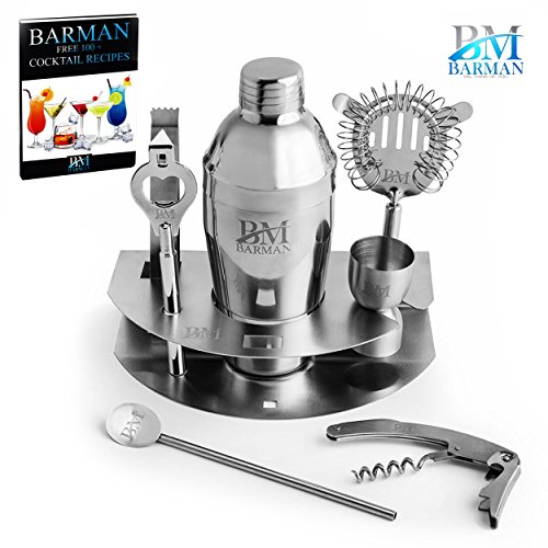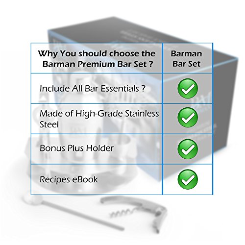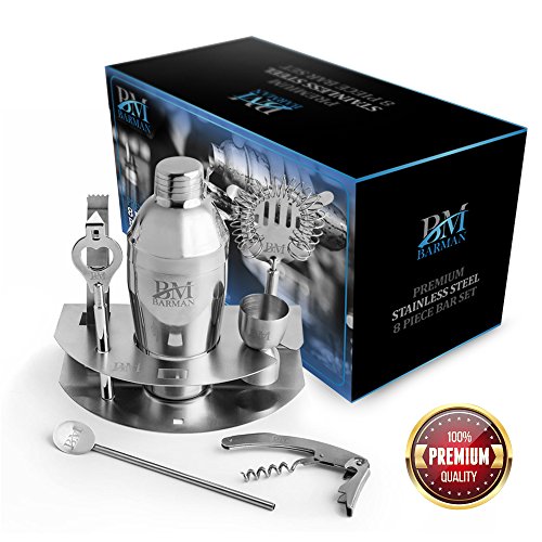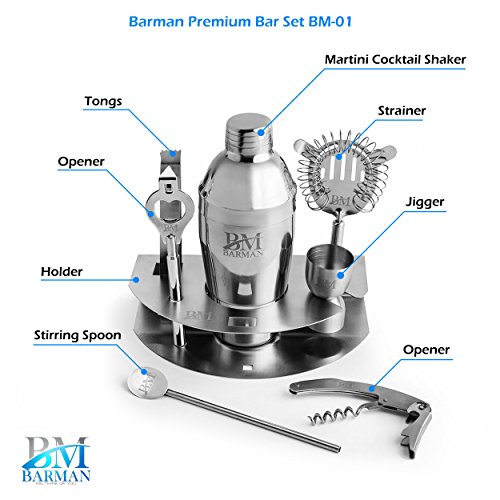 COMPLETE SET ? 8 pieces including the holder BEST MATERIALS ? All top-quality food-grade stainless steel SLEEK DESIGN ? Matches most decors with BARMAN BM logo LARGE QUANTITY ? Holds up to 6 drinks per shaker QUALITY BUILT ? Will not rust, crack, leak, or flake EASY CARE ? All parts dishwasher safe HI-END GIFT BOX ? Ready for giving