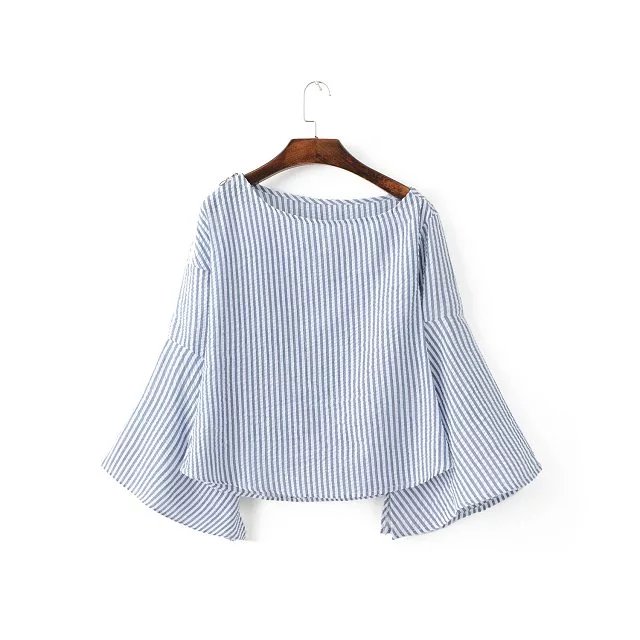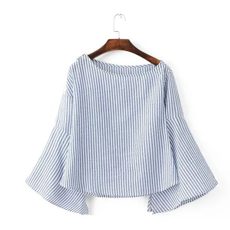 European Style Fashion Striped Flare Sleeve Shirt Women Round Neck Long Sleeve Loose Blouse Plus Size Tops