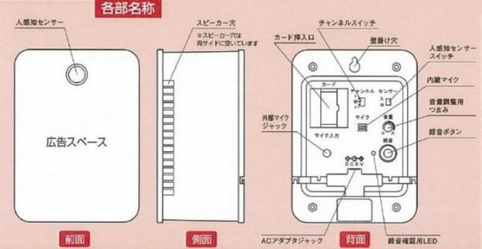 | 仕様 | 電源:DC5V 消費電力:約3W 音声出力:2W(最大) ACアダプタ:AC100V(50/60Hz)、コード長1.8m 録音カード付(本体に挿入済み) 使用環境:屋内(0度~40度) 人感知センサー:感知距離:0~2m(センサースイッチ「入」時のみ有効) メッセージ録音再生/チャンネル数:2チャンネル、録音再生時間:各チャンネル最大約90秒 |