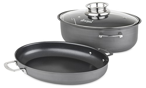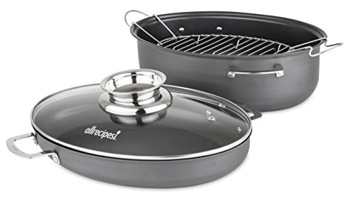 Studio : Allrecipes Publisher : Allrecipes Binding : Kitchen Product Description The Allrecipes 4-Piece Hard Anodized Nonstick 3-in-1 Oval Roaster includes the roasting pan, a lid that can be used as an au gratin/casserole dish, a stainless steel roasting rack, and a multi-purpose glass aroma lid. The combination of potential uses makes this the ultimate set for versatility and multi-tasking in the kitchen. The 8.5 quart capacity roasting pan holds up to a 16 pound turkey or can be used like a Dutch oven on the stovetop for large-batch soups and more. The stainless steel roasting rack can be hung from the sides of the pan to allow juices from meat to drip into the roaster for a flavorful gravy. The 4 quart au gratin pan can be used as a lid for the roasting pan; on its own as a casserole dish or for roasting fish, meat or vegetables in the oven; or directly on the stovetop as a saute pan, fry pan, or griddle. The vented glass lid - which fits both the roasting pan and the au gratin pan - allows you to "cook and look," keeping track of how a dish is progressing. The glass lid also features a small hole that allows you to drip in oil or wine to enhance the braising process and keep food moist. Elegant enough to take directly to the table for serving, this Allrecipes set is sure to become a go-to in your kitchen. Cleanup is a breeze thanks to PFOA-free nonstick coating in both the roaster and au gratin pan. All pieces are dishwasher safe. A note from our kitchen: The Allrecipes 3-in-1 Oval Roaster works on all stovetops except induction. Home cooks come to Allrecipes for everyday inspiration and practical, reliable solutions for food and cooking needs. Our cookware and kitchen products provide clever, solution-based features that remove the guesswork from cooking and make prep and cleanup easier. 0