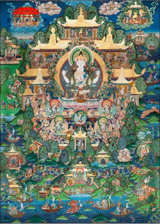 在密宗金刚乘中,最为人喜爱修的法门是‘四臂观音’和‘千手千眼观音’。四臂观音一面四臂,慈悲善良,头戴五佛冠,身穿轻柔天衣,坦胸露腹,戴着珍宝耳环、珍宝项链、珍宝璎珞,第一双手之右手持水晶念珠,左手持八瓣莲花;第二双手当胸合掌,双足跏趺于莲花宝座中央。
