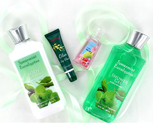 - Body Lotion: Spearmint Eucalyptus body lotion infused with Vitamin E, Aloe, and skin-softening Shea Butter, this formula soften dry rough skin and delivers long-lasting moisturizing.