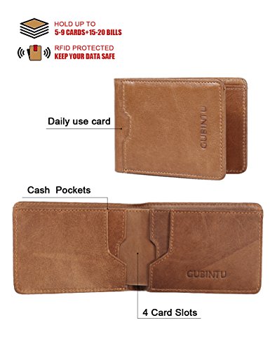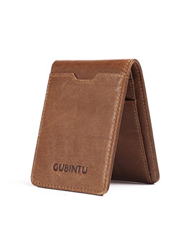 -. Binding : Apparel -. Brand : GUBINTU -. Department : mens -. Feature : MINIMALIST WALLET: Minimalist design, without redundant structures / BIFOLD WALLET: Hold up to 5- 9 cards:1 frequent use card in the front pockets and up to 8 in the inner pockets. / SLIM WALLET: It is so thin and small that you can put it in the Front pocket. / RFID BLOCKING WALLET: Signals of 13.56 MHz or higher frequency and thus protecting the sensitive data stored in RFID chips from unauthorized scans. / LEATHER WALLETS: Made of first-class genuine crazy horse leather: The crazy horse leather of retro and old style may come with irregular scratches, creases as well as spots on the skin (the scar of cow). This is a cortical feature rather than a man-made one and the minor scratches will disappear after wiping it with your fingers. In addition, the surface of crazy horse leather has been fully vegetable-oil tanned without being processed by any chemical material. It is healthy and environment-frie -. IsAdultProduct : 0 -. ProductGroup : Apparel -. ProductTypeName : ACCESSORY -. Size : Small -. Title : GUBINTU Men’s Front Pocket Bifold Leather Wallet Slim Minimalist RIFD Blocking