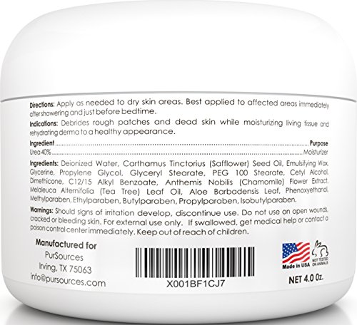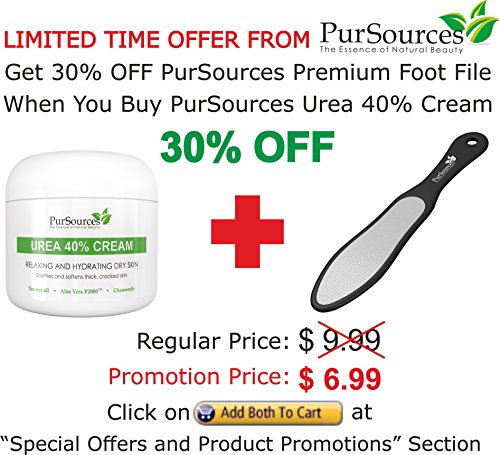Are You Tired of Dry, Cracked, Rough and Dead Skin? Uncomfortable dry feet with hard skin and cracks can cause a lot of irritation - not allowing you to focus on your work or get a comfortable sleep. Imagine if you could have the skin of your feet as healthy, nourished and smooth as that of your face. Would not you love to take out your footwear and flaunt it (instead of hiding) every time you had an opportunity? Feel this best Urea 40 % Healing Cream go to work from the moment you put it on. Formulated with the most potent and therapeutic ingredients, including pure Tea Tree Oil Aloe 200X Chamomile Extract work together to transform your skin: ? Deeply Moisturizing your feet and rehydrates skin to a healthy appearance. ? Effectively removes painful calluses, rapidly. ? Improving softness, increase circulation and preventing water loss. ? Gently exfoliates dead skin and promote new cell growth. ? Soothes and Softens Thick, Cracked and Dead Skin. ? Refreshing your skin and giving it a natural and pleasant fragrance. A BRAND YOU CAN TRUST All our products are Made in USA under the highest level of quality control, at an FDA registered facility, and with ingredients in their purest form, to ensure that you only get benefited with our products. PurSources Urea Cream is safe for diabetics, and our exclusive-proprietary formulation contains no added water or perfumes. WORKS OR YOUR MONEY BACK: If you're not happy for any reason, simply contact us and we'll give you a full product refund, no questions asked and no need to return the product. Order Your PurSources Urea Cream While It's Still In Stock! Click ADD TO CART NOW! 0 |
