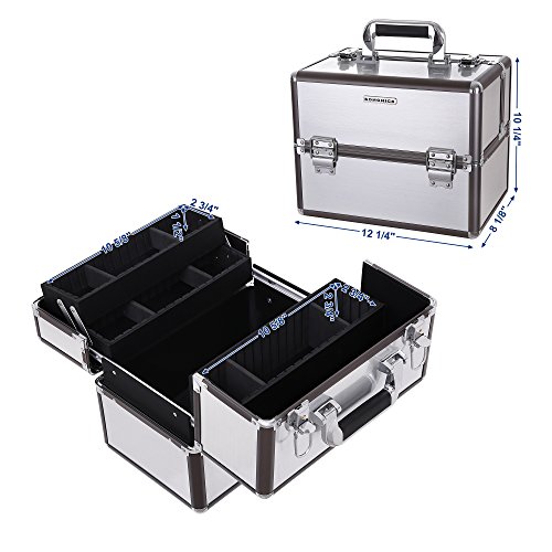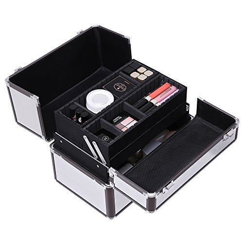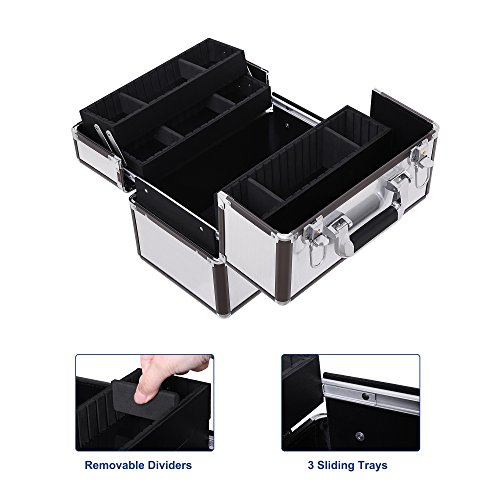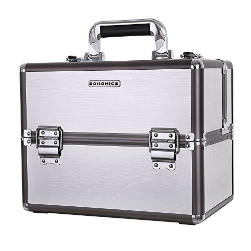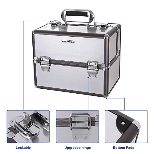 SONGMICS Professional Makeup Train Case with Sliding Trays Portable Cosmetic Box Storage Organizer 6 DIY Dividers Silver UMUC16S