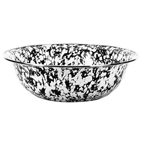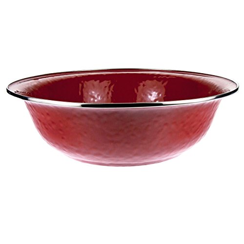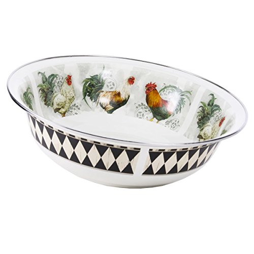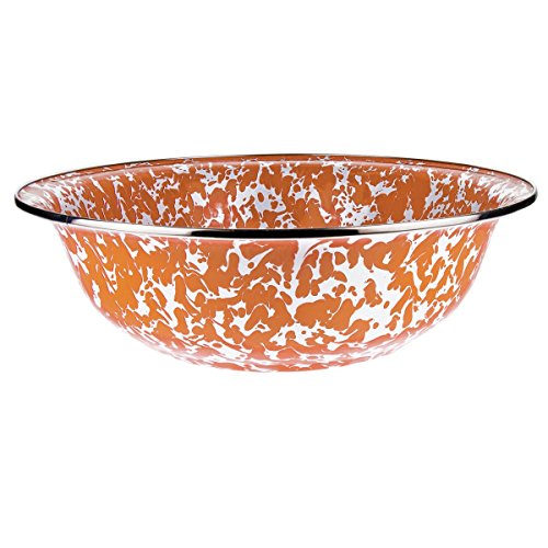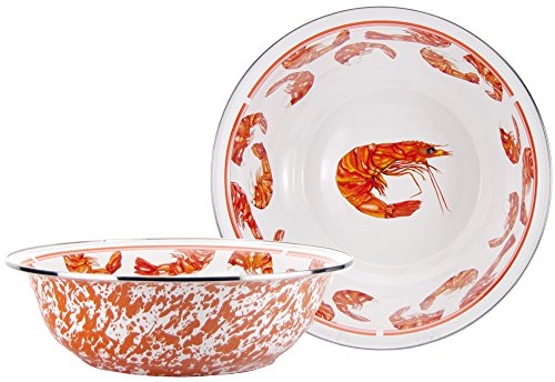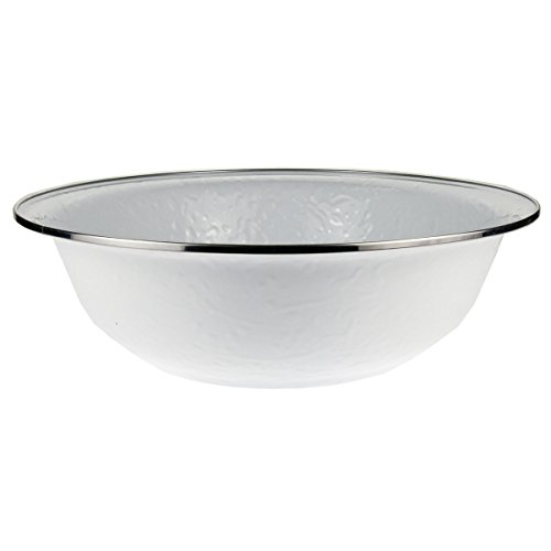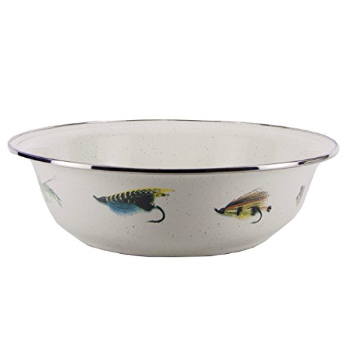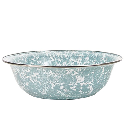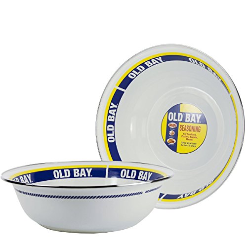 Golden Rabbit 13.5"X4" old Bay enamelware serving Basin. This enamelware is made of carbon steel coated with a porcelain enamel and trimmed in stainless steel. There will be variations in the shading of colors and pattern formations which are the results of the hand-dipped process. Golden Rabbit enamelware is created using a traditional handmade production method that has changed very little since the late 18th century. Each piece is hand-dipped and fired at extremely high temperatures causing the steel to Contract and fusing the porcelain enamel to the steel, creating a durable, non-porous surface.Feature