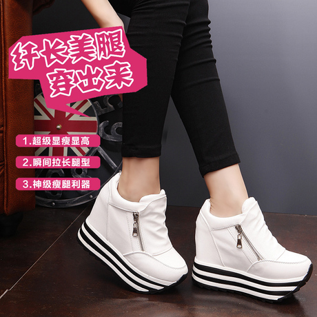 2016新款韩版厚底超高跟12CM内增高女鞋休闲真皮拉链松糕底34码单