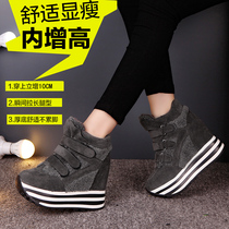 秋冬韩版超高跟真皮高帮鞋厚底内增高魔术贴加绒保暖休闲鞋潮女靴