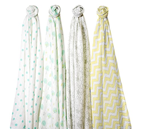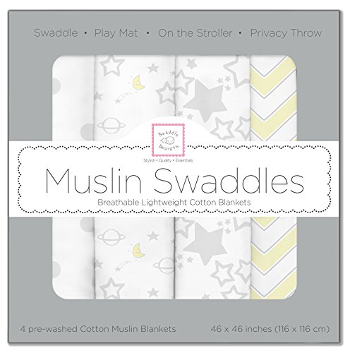 Wrap your baby in pure softness. Rest easy when your baby is lovingly swaddled in premium 100% cotton muslin. Our SwaddleDesigns quality muslin with cheerful designs and comforting colors gets softer with every wash. The open weave increases breathability and reduces the risk of overheating. The generous size and our helpful labels make swaddling easy as 123. Beyond swaddling, use as a nursing cover, sunshield on the stroller, playmat for tummy time, and more. Set of 4 packaged in a box. Each 46 x 46 inches (116 x 116 cm). Coordinates with a variety of our quality baby essentials. Machine wash gentle.Feature