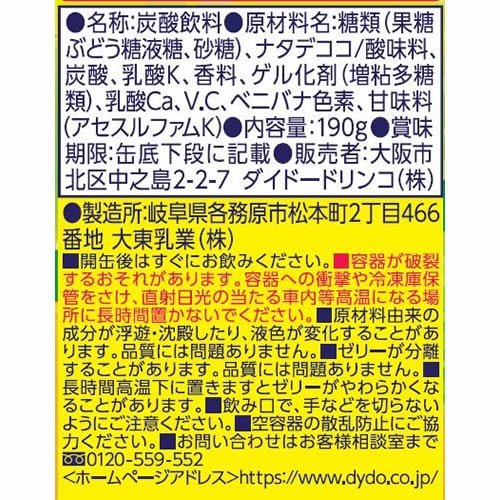 原材料:糖類(果糖ぶどう糖液糖、砂糖)、ナタデココ/酸味料、炭酸、乳酸K、香料、ゲル化剤(増粘多糖類)、乳酸Ca、V.C、ベニバナ色素、甘味料(アセスルファムK)