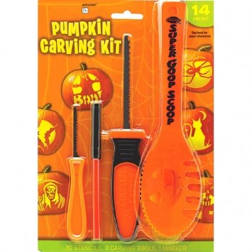 -. Feature : Basic Pumpkin Carving Kit w/Stencils 10 7/8" x 7 1/2" (Pkg / Size) Contains: 1 Carving Knife 1 Scooper 1 Detailer 1 Marker 10 Stencils