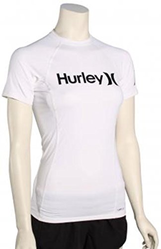 The Hurley Women's One & Only Short Sleeve Rash Guard features the Hurley name and logo on the front. It also features a huge Hurley logo on the left sleeve. Composed of 5OZ Lycra, this rash guard is light, durable, and has a UPF 40 rating to keep you burn free.