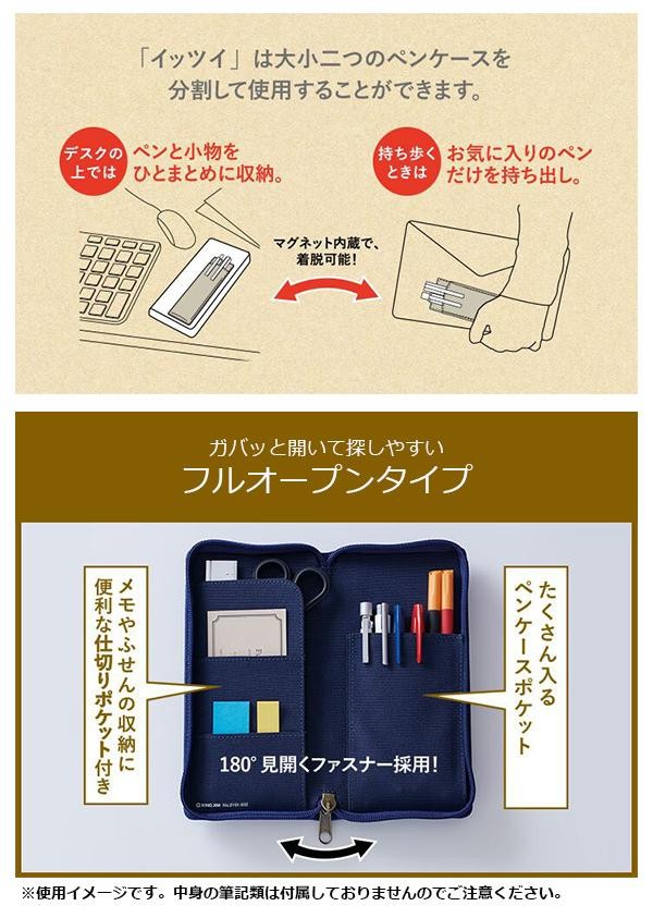 | 大小二つのサイズのペンケースが、マグネットで一体型になっているペンケースです。一つにまとめたり別々にして持ち歩くことが可能なので、使用するシーンに合わせて必要な容量のペンを持ち歩けます。開口部が180度開くフルオープンタイプで、中に入れたペンや小物を探しやすい構造です。メモやふせんの収納に便利な仕切りポケット付き。 |