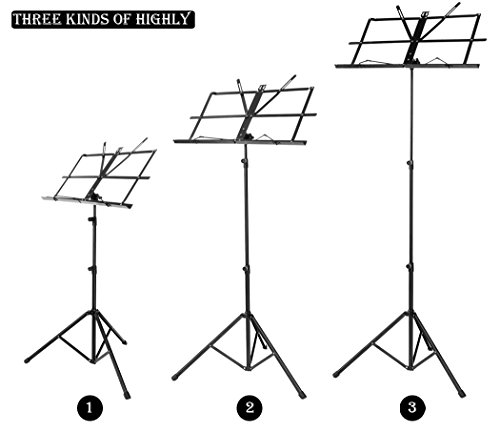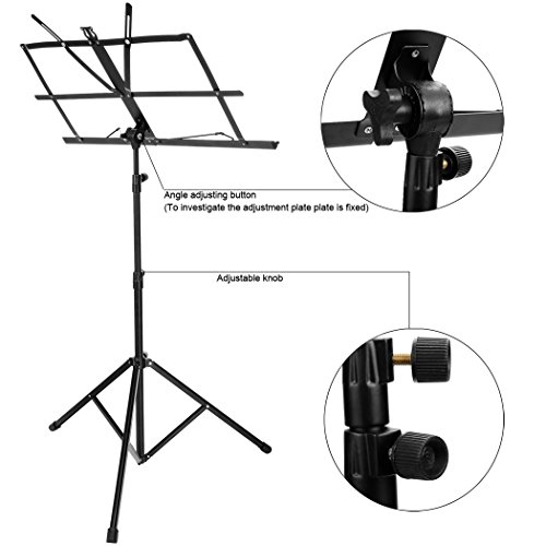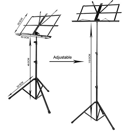 -. Feature : Enough Space:The bookplate of the music stand is 19.5 x 11.3 inch, which is enough for hold the music sheet. / This music stand has metal tripod support legs to make sure the loading capacity, so just pour 100% concentration on your performance. / Adjustable: Tilting bookplate can freely adjust angle and make this stand perfect for sitting or standing. / Foldable:Tripod support legs can freely fold up/ retract, stable and tough. / It is suitable for school, orchestras, choirs, church band and other open space. And it's perfect for guitar, keyboard, violin, conductors,etc.