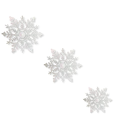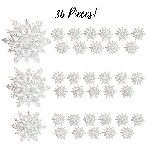 - WHITE GLITTERED SNOWFLAKES. This is an assorted set of 36 white snow flake ornaments. In this combo pack you will receive, 12 of 4", 5" and 6" snowflakes. Each one is made of a molded plastic material and drenched in white iridescent glitter. These are a beautiful addition to any colored Christmas tree.