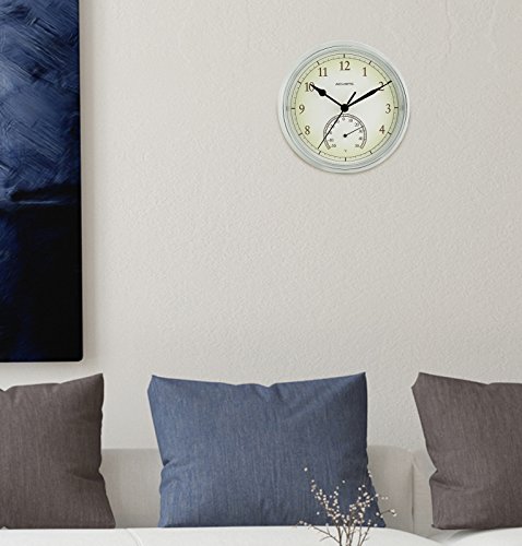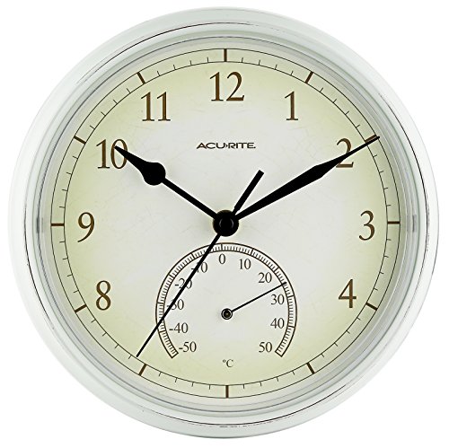 -. Binding : Kitchen -. Brand : AcuRite -. Color : White -. EAN : 0646437551861 -. Feature : Acurite white finish decorative wall clock measuring 9.25 inch in diameter. / Durable and weather resistant, great for indoors and outdoors. / Features a celsius thermometer from -50 to 50. / For accurate results don't place under direct sunlight or heat. / Operates on 1 AA battery (not included). -. IsAutographed : 0 -. Label : Acurite -. Manufacturer : Acurite -. Model : Acurite -. ProductGroup : Home -. ProductTypeName : HOME -. Publisher : Acurite -. Studio : Acurite -. Title : Acurite Indoor Outdoor Weather Resistant Wall Clock With Thermometer 9.25 Inch -. UPC : 646437551861