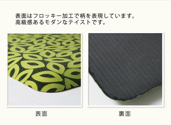 ポリウレタンを使用したふかふかとしたマットです。ボリュームのある厚さ(約15mm)で底付き感を感じにくい仕様です。表地にはフロッキープリントを施し上品に仕上げました。丸くカットした角はつまづきにくく、めくれにくくなっています。玄関、キッチンいろいろな場所でご使用いただける商品です。