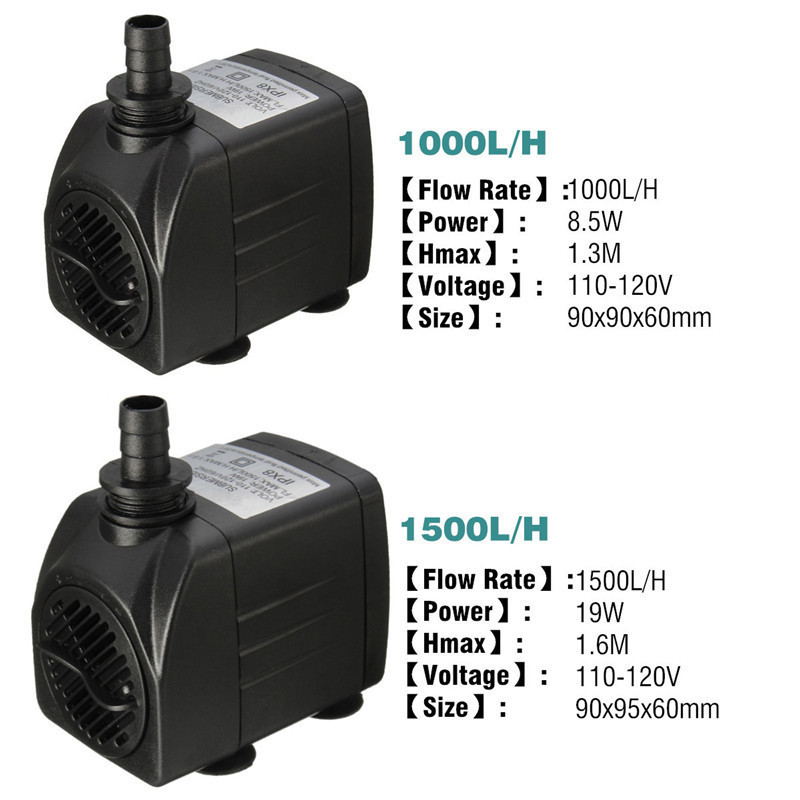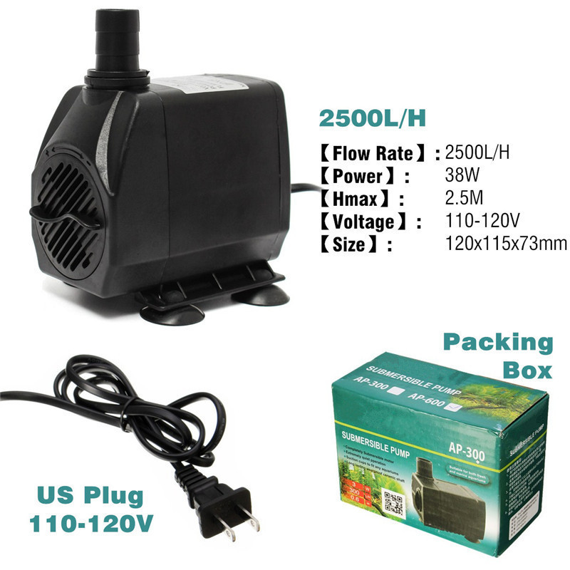 Specifications: Completely submersible pump. Extremely quiet operation. Adjustable flow rate. 4 suction cups to fit onto any aquarium (200LPH has 2 suction cups). Long lasting wear proof ceramic shaft. Suitable for fresh and sea water applications. Low power operation. Corrosion resistant. Ideal for aquariums, fountains, fish ponds & tanks. Plug Type: US Flow Rate: 300L/H 600L/H 1000L/H 1500L/H 2500L/H