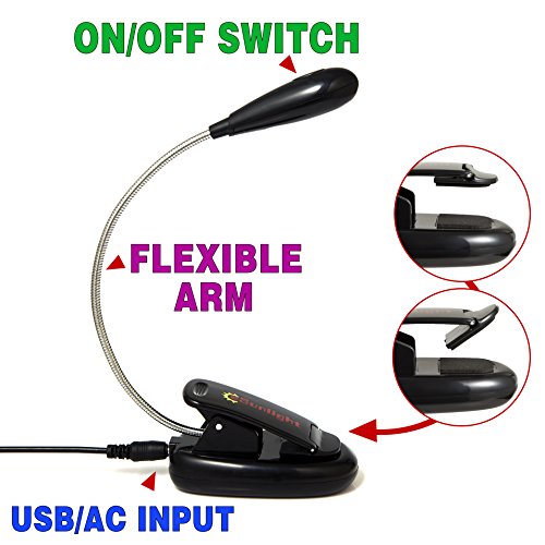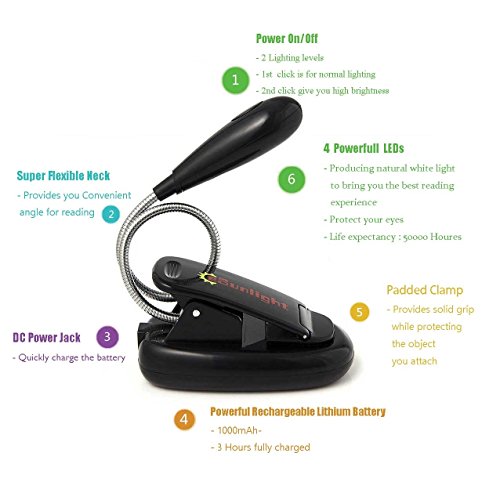 CeSunlight LED Book Light, Rechargeable Reading Light, Flexible and Easy Clip On Task Light, with Extra-Bright 4 LED, 2 Brightness setting, Soft Padded Clamp, Comes with USB Charging Cable (Black) B01CXM8EJ6