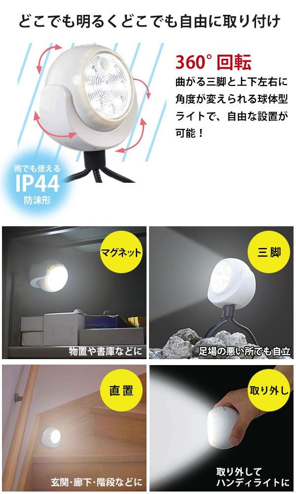 防沫型で雨でも使えるLEDセンサーライトです。曲がる三脚でいろんな場所に置けて、外せば磁石でスチール製のものにくっつきます。ぐるぐる可動する球体型で角度も自由自在。明るいSMDLED使用。 |
