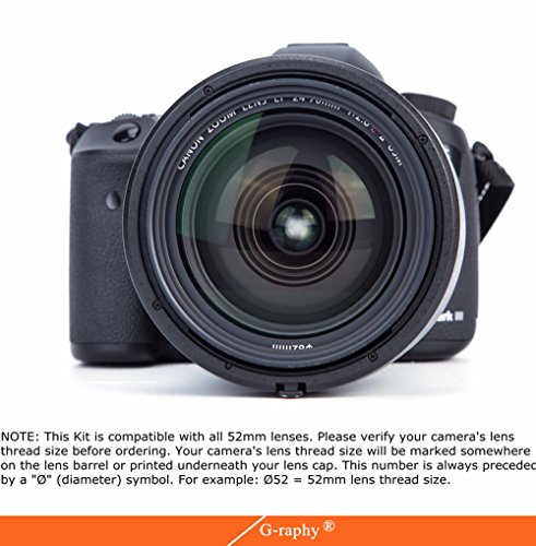 NOTE: This Kit is compatible with all 52mm lenses. Please verify your camera's lens thread size before ordering. Your camera's lens thread size will be marked somewhere on the lens barrel or printed underneath your lens cap. This number is always preceded by a "Ø" (diameter) symbol. For example: Ø52 = 52mm lens thread size.