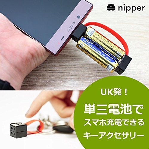 -. Feature : ※注意 iPhone、ガラケー、Android(TYPE-C)には別途変換コネクタが必要です。あとほんの1分でいいから・・・」と祈りつつスマホ充電が切れてしまう。こんな時にかぎってモバイルバッテリーも充電切れ。コンビニで使いきりの充電器見つけるも意外と高い!それでも仕方なく買ってしまう・・・。こんな経験一度はありませんか? / これからは単三電池だけ入手できればOKです。100円ショップや薬局、それに世界中のいたる所で比較的安価で容易に入手可能な単三電池があればスマホ充電ができてしまうキーアクセサリー、それが「nipper(ニッパー)」です。 ※出力用端子はmicroUSBタイプ(Android他)のみです。iPhone、ガラケー、Android(TYPE-C)には別途変換コネクタが必要です。 / 出先でちょっと1件だけ電話したいのに充電不安・・・って時に本当に助かります。単三電池なら比較的どこでも購入できますし、「nipper」本体もキーチェーンにつけていてもさほど邪魔にはなりません。 また、自宅の引き出しの奥に眠っていた単三電池を「nipper」に取り付けてスマホを 充電し使い切った状態で気持ちよく廃棄もできちゃいました。 / 単三電池でスマホ充電ができるキーアクセサリー 「nipper(ニッパー)」はUK生まれのキーアクセサリーです。普段はキーチェーンに取り付けて持ち運べます。マグネットで固定されているので脱着も簡単です。ケーブル部分は柔軟性と頑丈さを兼ね備えたシリコン製で触り心地も快適です。 / アルカリ単三電池2本で約3時間の通話または最大で20%程度のスマホ充電が可能です。 ※ 新品電池利用時で通話可能時間と充電%は目安です。機種によって異なります。