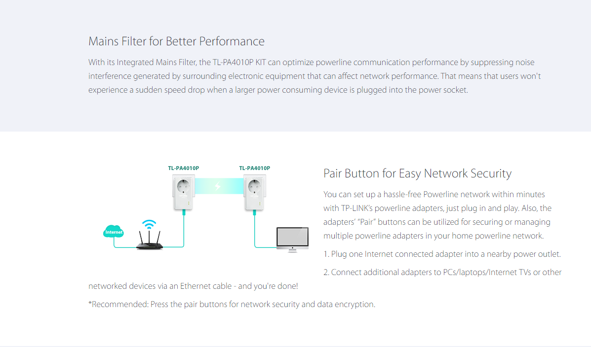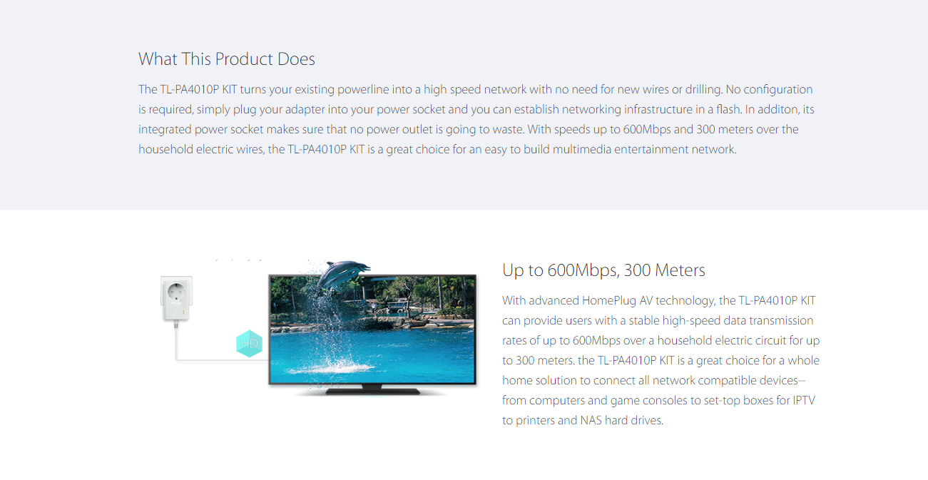 • Data transmission rates up to 600Mbps1 over electrical wires, ideal for HD video streaming
