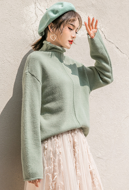 パステルカラーが女性らしくふんわりとした印象の長袖タートルネックニットです。
