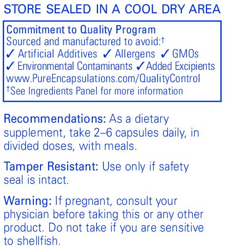 FREE FROM: Pure Encapsulations products are free from wheat, gluten, egg, peanuts, magnesium stearate, hydrogenated fat, artificial sweeteners and colors, and other unnecessary excipients. Any product containing ingredients derived from allergens, such as soy, dairy or shellfish is clearly labeled. * These statements have not been evaluated by the Food and Drug Administration. This product is not intended to diagnose, treat, cure, or prevent any disease.