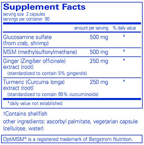 Glucosamine sulfate and MSM provide intrinsic compounds essential for healthy cartilage formation, including glycosaminoglycans and elemental sulfur, respectively. MSM has also been attributed with enhancing healthy immune cell activity, thereby supporting tissues surrounding the joints. These important cartilage matrix constituents are complemented with additional factors for supporting a healthy immune response. In studies, ginger promotes healthy prostaglandin and leukotriene biosynthesis. Curcumin helps maintain healthy neutrophil function and scavenges free radicals such as nitric oxide.