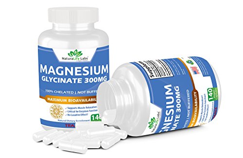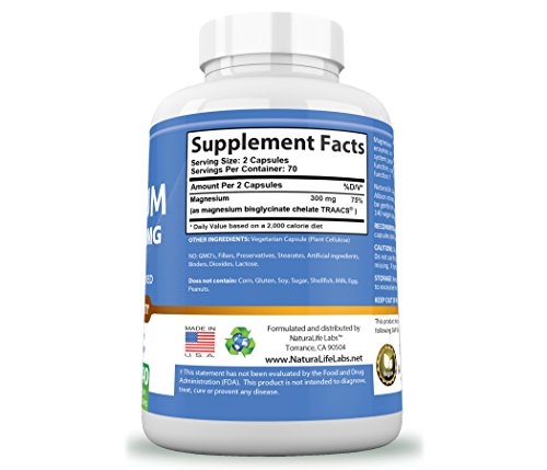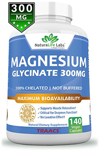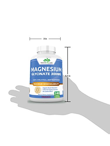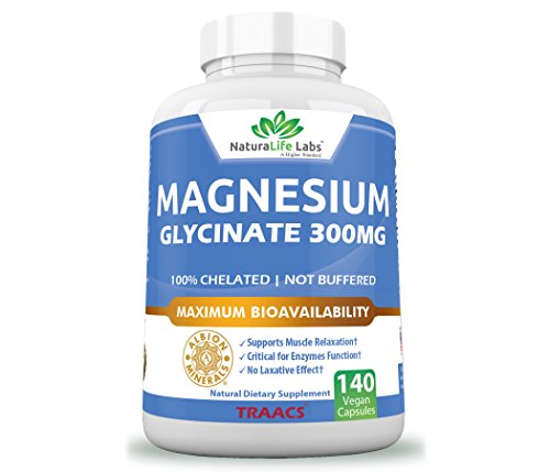 NaturaLife Labs Magnesium Glycinate 100% Chelated formula contains 140 vegan capsules 300 mg per two vegan capsule serving of high bioavailable Magnesium Glycinate. Our vegan capsules dissolve quickly, contain no gelatin and are absorbed significantly better than tablets. This form of magnesium is attached to amino acid glycine, which makes the magnesium desirable because it has no laxative effect and is gentle on your stomach.†Magnesium supports:†