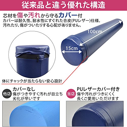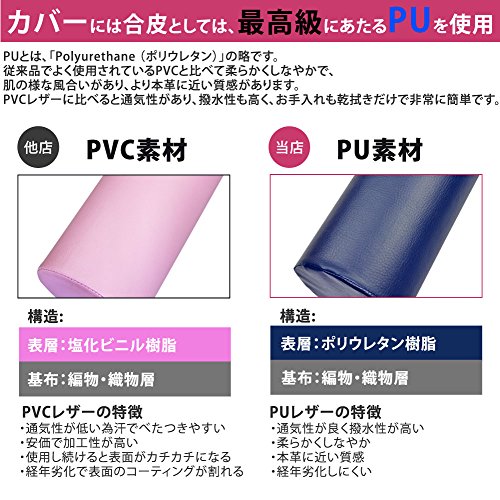 また、カバーは最高級合皮「PUレザー」の特別仕様です。PUレザーは一般的な合皮(PVC素材)より通気性が良く撥水性も高いのが特徴です。また、経年劣化しにくく耐久性が高いので、ヨガポールに適しています。