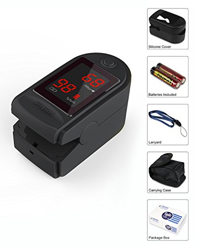 -. Title : Fingertip Pulse Oximeter Blood Oxygen Saturation Monitor with Carrying Case, Batteries, Silicone cover and Lanyard - Concord Basics available in 5 colors