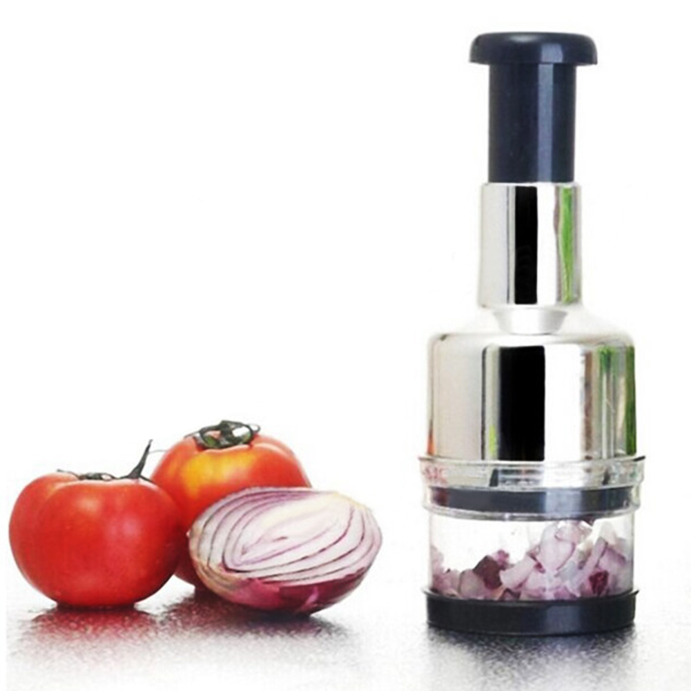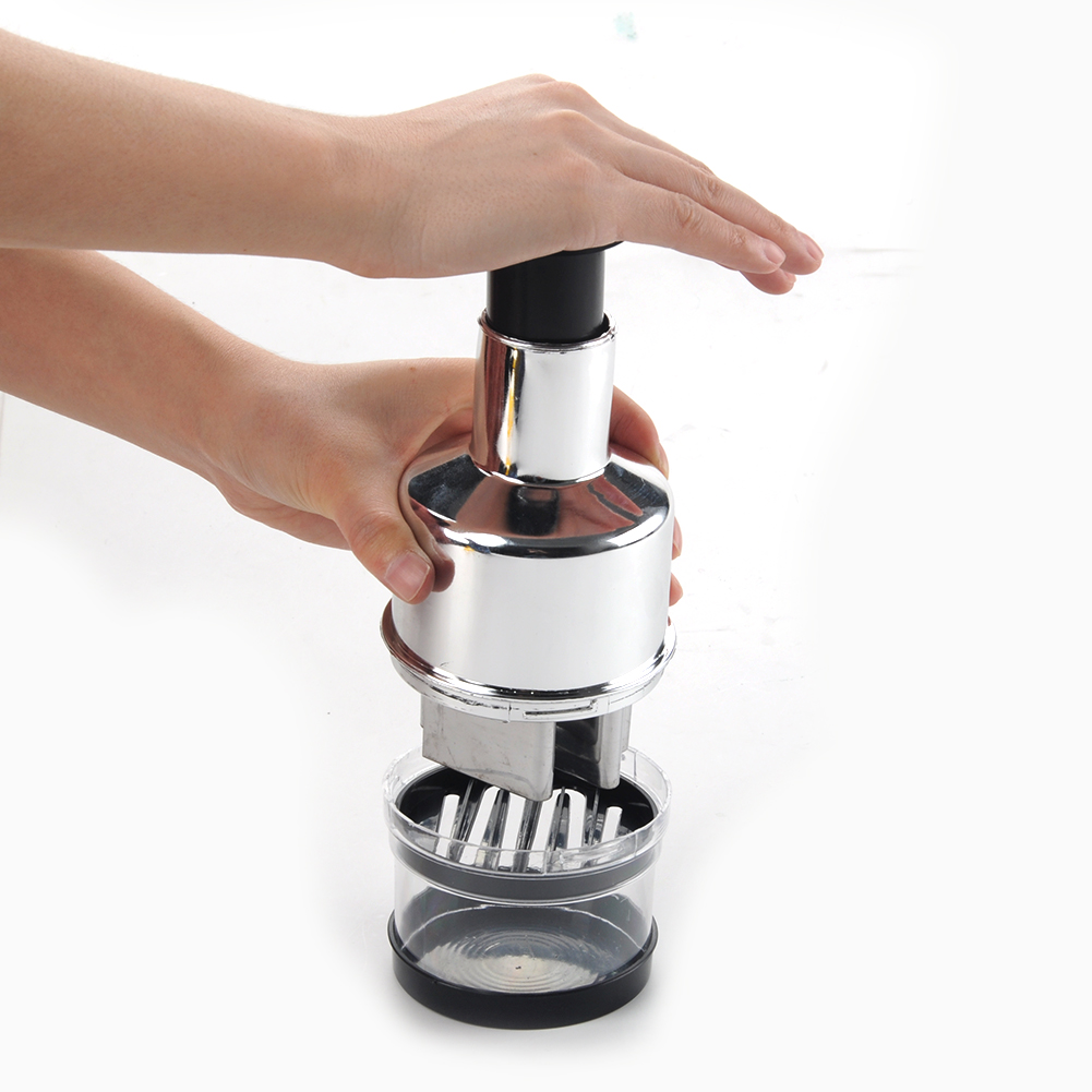 Description: The Stainless Steel Onion Chopper Slicer is great for dicing and chopping onion/vegetable/garlic. Chop different vegetable easily and quickly by pressing. Made of food grade plastic and stainless steel blade, safe to use. Multi-layered, easy to disassemble and clean.