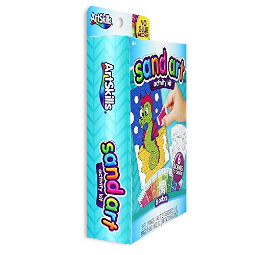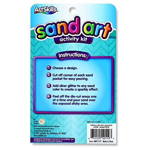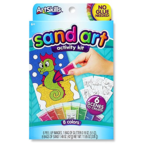 - Activity kit includes 6 peel and sprinkle sand picture designs, 8 packets of sand and 1 bag of glitter for a sparkly effect. No glue needed!