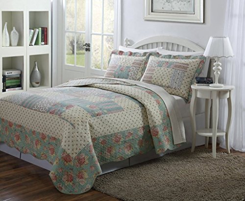 Product Description Bedding in bloom! Quilt with nice light blue, taupe and pale yellow floral patchwork patterns . This ensemble offers a variety of expertly crafted details that complete the relaxed presentation. These are machine washable for easy cleaning and maintenance. Great color for the Summer season. Set includes 1 bedspread and 2 shams. 0