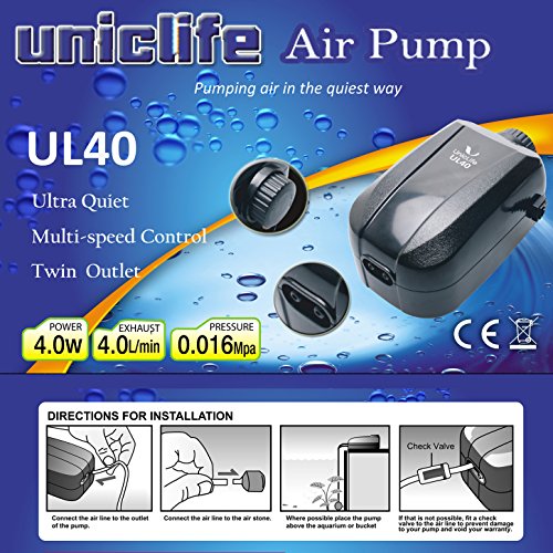 Uniclife Aquarium Air Pump 4 Watt 4-LPM 2 Outlets with Accessories, Adjustable Oxygen pump for 20-100 Gallon Fish Tank