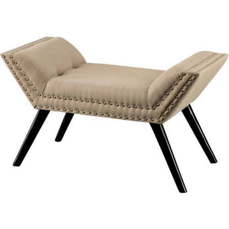 -. Feature : A stylish way to add an extra seat or to simply add decor! This beautiful contemporary bench features a unique angled bench supported on long tapered legs for a luxurious modern appeal. Its double nailhead trim adds a hint of glamor and its cushioned seat offers a comfortable seating experience. A bold and beautiful statement piece to integrate into your home! / Cushioned seats with button tufted angles Double nailhead trimming adds a luxurious contemporary touch / Flared and angled armrests to match flared legs Supported on tall tapered wooden legs / 35"W x 17.25"D x 19.75"H / All customers receive our Expert Guide about Your Home, Your Style, Your Choice from Elevate Store