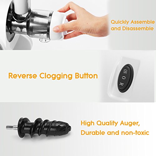 Easy to Clean - This masticating juicer’s parts are completely detachable, no extra tools needed, for easy cleaning and storage. Cleaning brush is included.