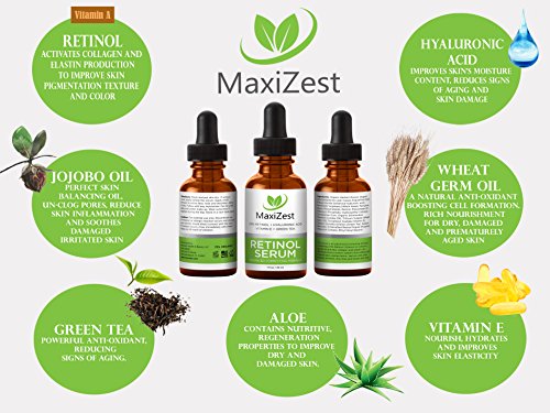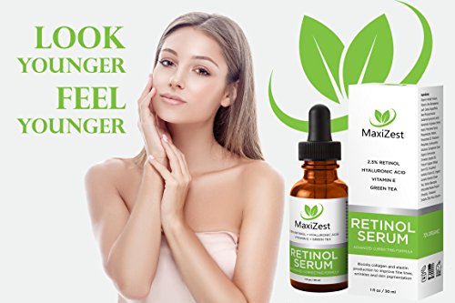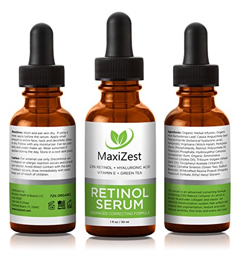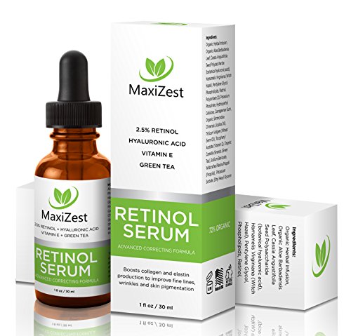 -. Binding : Misc. -. Brand : MaxiZest -. EAN : 0646437239653 -. Feature : FAST RESULTS: Our #1 Best Selling Retinol Serum 2.5% absorbs quickly and completely. Antioxidants and moisturizers work from deep within the skin layers to remove dead skin cells, unclog pores and promote healthy new tissue growth. Look Younger and Feel Younger! / 100% CRUELTY FREE, HIGHEST QUALITY PURE, NATURAL & 72% ORGANIC: Made in the USA in FDA certified and GMP compliant facility. Fragrance Free and contains NO Fillers, NO Alcohol, NO Sulphates. Never tested on animals. / 100% SATISFACTION GUARANTEE: MaxiZest is a premium brand and we are confident that you will love our natural skin care products and see fast results. If for any reason you are not satisfied with our 2.5% Retinol Serum, we offer a 90 Day 100% Money Back Guarantee. No questions asked. Stocks are selling fast, so to start turning back the clock on your skin, Click the Orange "ADD TO CART" Button at the Top Right and BUY RISK FREE NOW! / ADVANCED CORRECTING FORMULA: Contains a powerhouse of natural, plant-based ingredients. Maximum strength 2.5% Retinol (Vitamin A), Green tea, an organic herbal infusion, botanical Hyaluronic acid, Vitamin E and Jojoba oil work synergistically together to reverse the signs of ageing with less dryness and irritation to your skin. Our retinol night serum for face is gentile enough for daily use and is also the perfect face serum for oily skin. Also suitable for all other skin types including for sensitive skin. This anti-aging face product is the perfect retinol face serum for men and women / EFFECTIVE MOISTURIZATION SYSTEM: Softens and heals skin from the inside out. The molecular structure of our 2.5% retinol anti aging serum allows for deep penetration where collagen and elastin are activated to improve skin texture and color - An amazing hyperpigmentation treatment system. Also the best retinol anti wrinkle anti blemish treatment for deep wrinkle repair. Enjoy an amazingly even skin tone and marvel at your skin's soft, radiant and youthful appearance. Best under eye dark circles treatment and acne scar treatment. -. Label : MaxiZest -. Manufacturer : MaxiZest -. ProductGroup : Beauty -. ProductTypeName : BEAUTY -. Publisher : MaxiZest -. Studio : MaxiZest -. Title : RETINOL SERUM 2.5% - With Hyaluronic Acid + Green Tea + Vitamin E + Jojoba Oil - Our #1 Best Anti Wrinkle Anti Aging Serum for Face, Eyes, Fine Lines and Under Eye Dark Circles - Unclogs Pores, Evens Skin Tone, Improves Skin Color - 1oz (30ml) -. UPC : 646437239653
