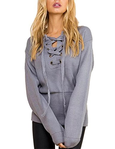 -. Title : Lace up Sweater Jingjing1 Women V-Neck Drop Shoulder Ribbed Knitted Pullover Jumper Top [並行輸入品]