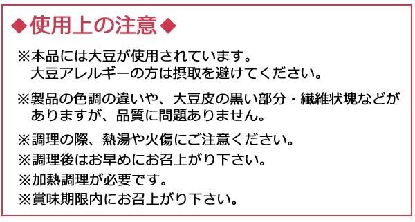 | 原材料 | 名称:大豆加工食品 大豆(遺伝子組み換えでない)(北米産) |