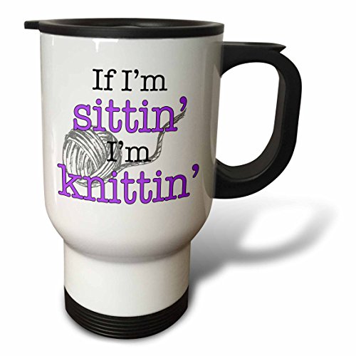 3dRose tm_193224_1 If I'm Sittin I'm Knittin Purple Stainless Steel Travel Mug, 14 oz, White