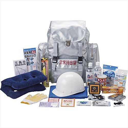내용:비상용 대형 지내밀기 배낭:530×460×210mm《미도리》안전 헬멧 다이나《모》방적 라디오×각1,보존 수500ml(5년 보존)×2,건빵100g(5년 보존,밀)블루 씨트:1800×1800mm 2WAY쿠션 비상용 급수 백5L방재용 간이 라이트 삼각건 폴리 랩 일회용 마스크 간이 구급 세트(반창고5 매면봉5개 코튼3매)알루미늄 온열 씨트 수에 흘려 보내는《데잇슈》(10매)5년 보존 Wet 티슈(20매)휴대 화장실(볼일)비상용 요부코적(ID카드부)미끄럼방지 목장갑 방재 가이드 메모×각1