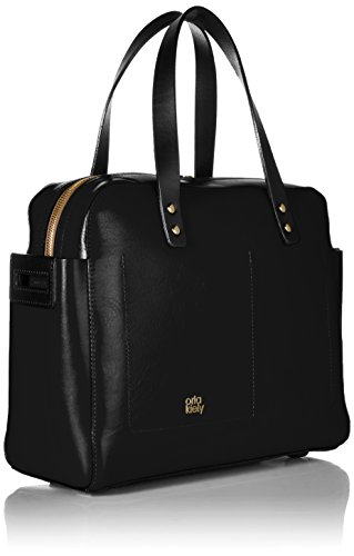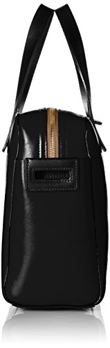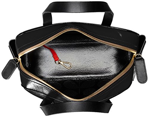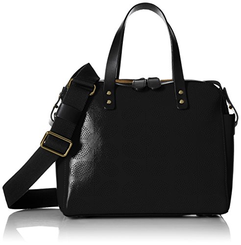 Sixties stem' leather structured bag with punched multi stem detail on the front. Bag has double zip closure, two top handles and an adjustable detachable long webbing strap. Gold colored hardware. Inside details include foil coating inside finish, elastic key chain and two slip pockets.