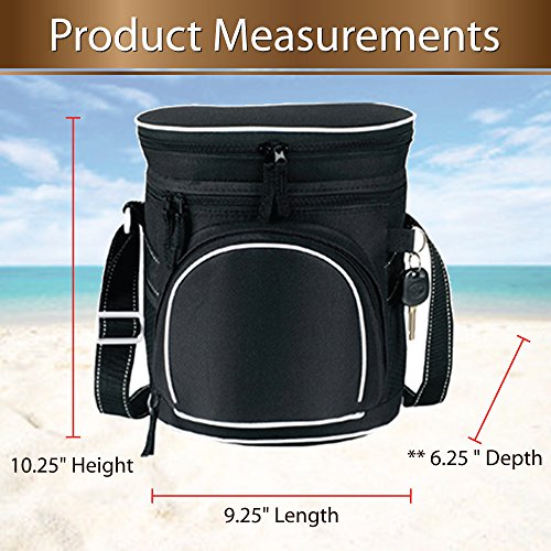 ITEM SIZE: 9.25"L x 10.25"H x 6.25"D. Adjustable shoulder Strap Length: 23 to 44.5 inches. Main compartment hold up to 12 can.